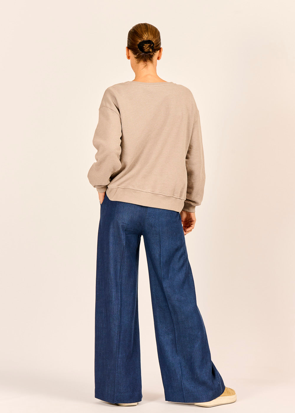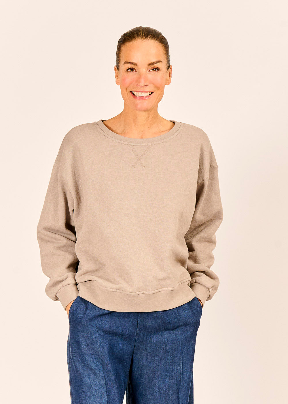 Dieses lässige Sweatshirt in der modernen Farbe Fango (ein warmes Taupe) ist Ihr neues Essential für stilvolle Gemütlichkeit im Alltag. Gefertigt aus einem wunderbar weichen Material, verspricht es maximalen Wohlfühl-Komfort und wird schnell zu Ihrem Lieblingsstück. Der lockere Schnitt und der klassische Rundhalsausschnitt mit dezenten Ziernähten sorgen für einen cleanen, entspannten Look. Kombinieren Sie das vielseitige Basic zur Jeans für einen unkomplizierten Casual-Look oder als stilvollen Bruch zu eleganten Hosen.